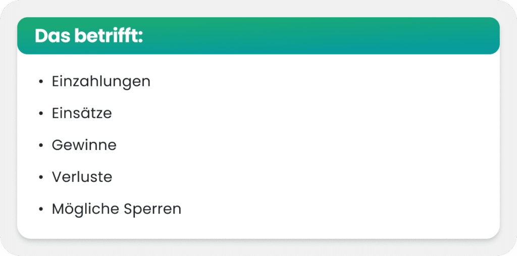 Beispielsweise findet ihr in den Datenschutzerklärungen der Anbieter, dass sobald ihr ein Spielerkonto eröffnet habt, euer Name, Geburtsdatum und Anschrift an das staatliche IT-System gemeldet werden.